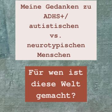 Gedanken zu ADHS+/autistischen vs. neurotypischen Menschen Ich beantworte es natürlich gleich, weil Cliffhanger kann ich nicht: Weder noch. Auch wenn wir in der Community immer so gerne sagen, dass wir in einer Welt leben, die nicht für uns gemacht wurde, in einer Welt, die auf NTs (neurotypische Menschen) ausgerichtet ist, einer Welt, die von NTs … Mehr Für wen ist diese Welt gemacht?